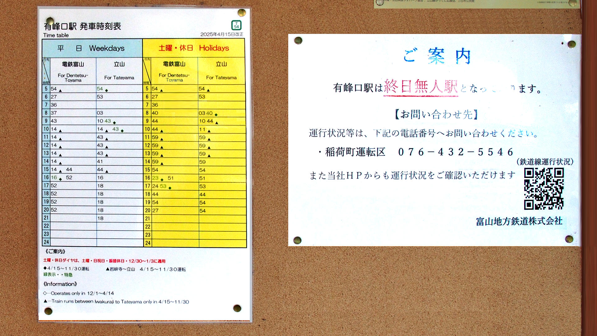 有峰口駅は1937(昭和12)年10月1日に富山県営鉄道の小見駅 として開業した。富山県営鉄道は電源立県をめざす富山県が有峰ダム建 設を目的に敷設した。完成した有峰ダム有峰湖への最寄り駅であり、観 光客誘致の目的で1970(昭和45)年7月1日有峰口に改称された。 無人駅でホームは島式で交換可能駅となっている。立山線の途中行き 違い可能駅は五百石、岩峅寺、有峰口となっている。電鉄富山駅側の県 道に架かる橋梁を渡った先に富山地方鉄道小見変電所がある。橋梁直前 にポイントが設置されている。駅舎は2020年2月リフォームされた。 変電所先の千垣−有峰口間には県道の芳見橋と平行して常願寺川を跨 ぐ鉄橋が架かっている。電鉄富山駅から立山駅へ向かう列車ではここを 超低速で通過し観光案内の放送が流れる。電鉄富山駅へ向かう列車では 案内放送はないが橋の前後が急曲線になっている為時速20q前後で通 過する。この鉄橋は小見鉄橋と呼ばれていたが最近は千垣鉄橋と呼ばれ ることが多い。 今でも駅の利用者は小見集落の人たちで、駅から徒歩20分の和田川 沿いには亀谷温泉があり亀谷温泉白樺の湯、白樺の湯前に大山歴史民族 資料館がある。 有峰ダムは常願寺川の支流和田川に作られた発電を主目的としたダム で建設は1939(昭和14)年富山県により始められた。 南富山から岩峅寺を経て粟巣野に至る鉄道も富山県によって建設され た。その後、電力統合で日本発送電に移ったが、戦争のため1943 (昭和18)年から1950(昭和25)年まで電源開発は中断された。 |