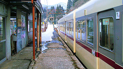 立山線の前身の富山県営鉄道が粟巣野まで開通した1937(昭和1 2)年10月1日に開業した。富山県営鉄道は富山県が常願寺川の治水 と電源開発を行うことになったため設立された。粟巣野開通時に600 Vから1500Vに昇圧された。当時は本宮と粟巣野の間に芦峅寺駅が あったが付近に民家はなく、常願寺川対岸の芦峅寺集落へは行くことが できなかった。粟巣野駅は千寿ヶ原鉄橋手前に立山仮駅ができるまで終 着駅だったが1981年に廃駅となった。 対岸の芦峅寺に「まんだら遊苑」があるが、立山大橋を渡る場合でも 大きく迂回せねばならず最寄り駅は千垣駅となっている。 ハイキングなどでは帰路に立山大橋を渡って本宮駅を利用することが できる。 本宮駅はかつて相対式ホームの交換可能駅だったが現在は片面ホーム となっているが線路やホームは残っている。廃止ホーム側に高尾建設の 本社工場がある。ここから立山駅までは 約5kmだが、急勾配、急曲線 のため10分かかる。冬季はこの駅より先立山駅までは乗客なしの列車 も多い。 |