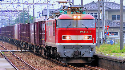 ![]() 1番線を発車した521系富山行き ![]() 1番線を通過するEF510-8牽引のコンテナ列車 ![]() 1番線を通過するEF510-514牽引のコンテナ列車
