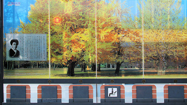 蓮町駅岩瀬浜方面ホームの馬場記念公園イメージ広告 富山化学