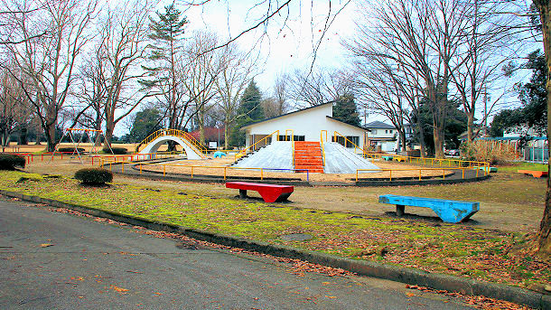 梅が咲くころの遊具広場 遊具の奥は富山市北部児童館