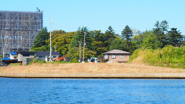 富岩運河水上ライン建設中の富士フイルム富山化学新工場と馬場記念公園