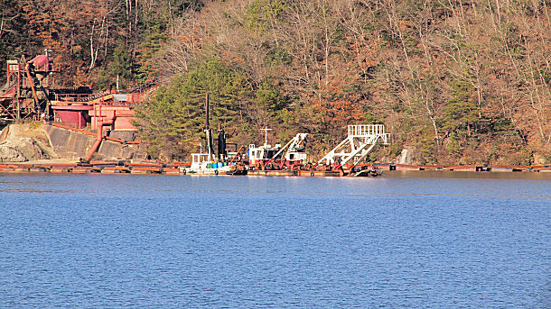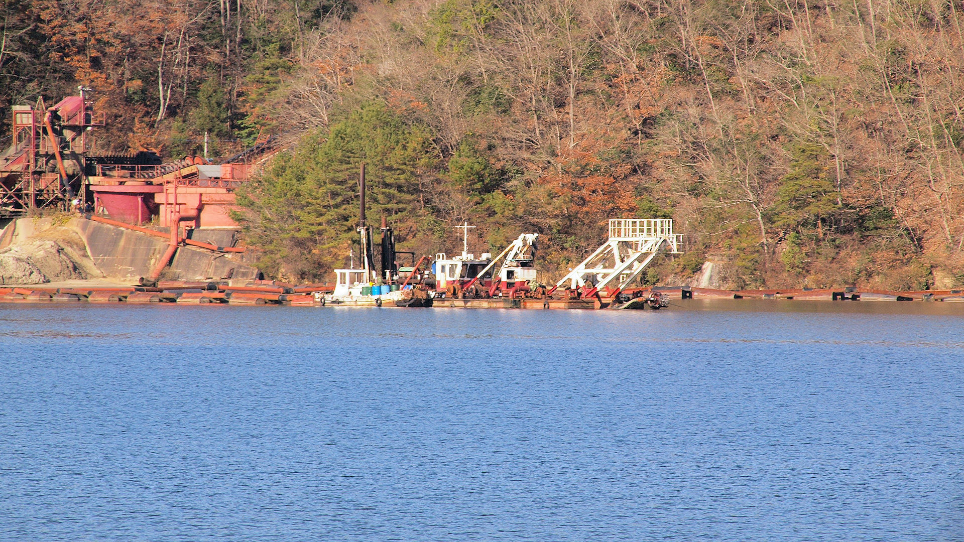 恵那峡国際ホテル裏から右岸の浚渫船と土砂の処理設備