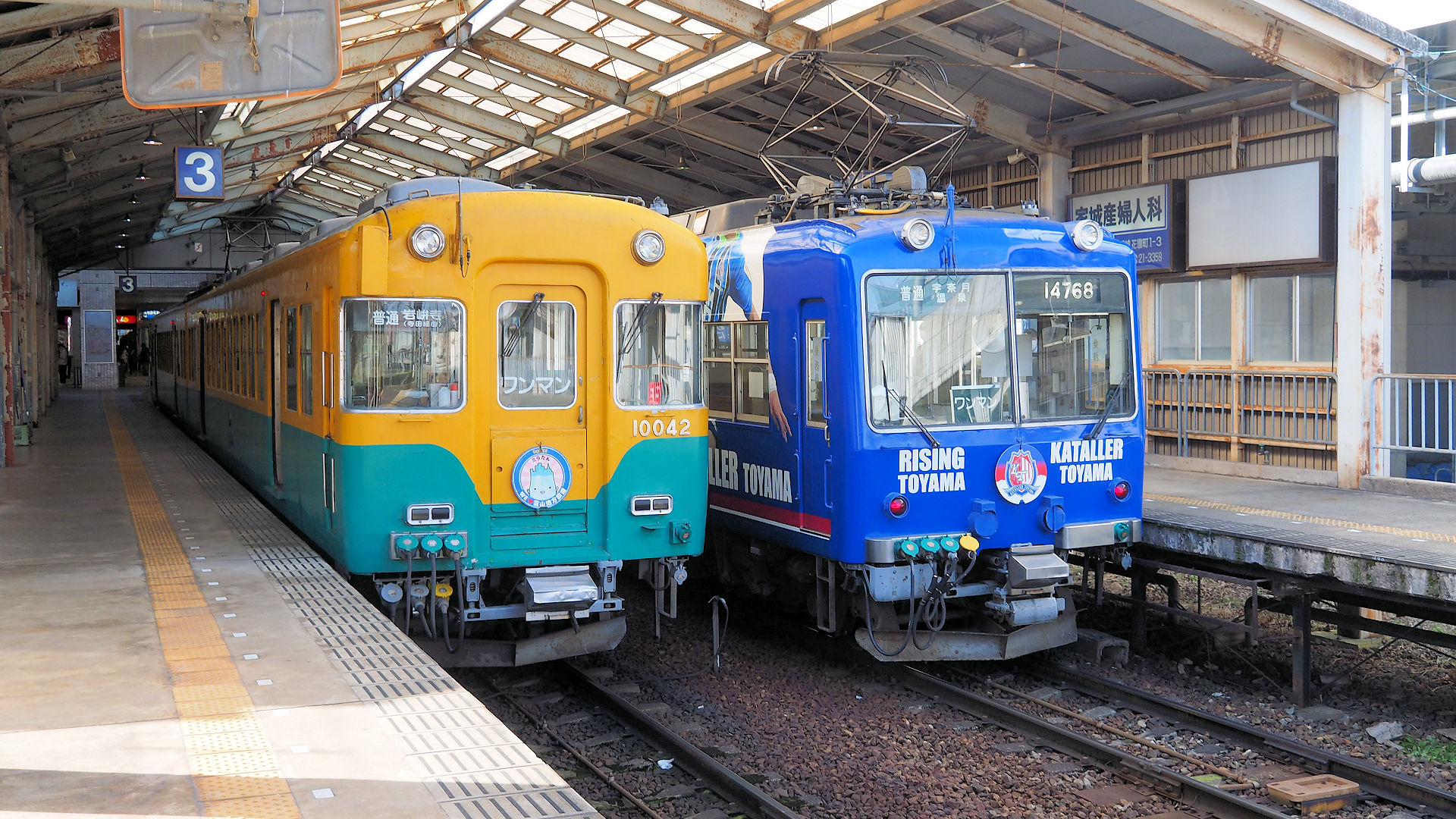 電鉄富山駅に停車中の10030形寺田経由岩峅寺行きと14760形