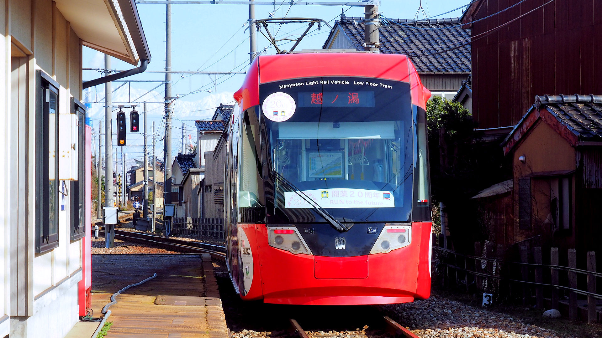 新湊港線中新湊駅を発車したMLRV1004越ノ潟行き 2023/02/22
