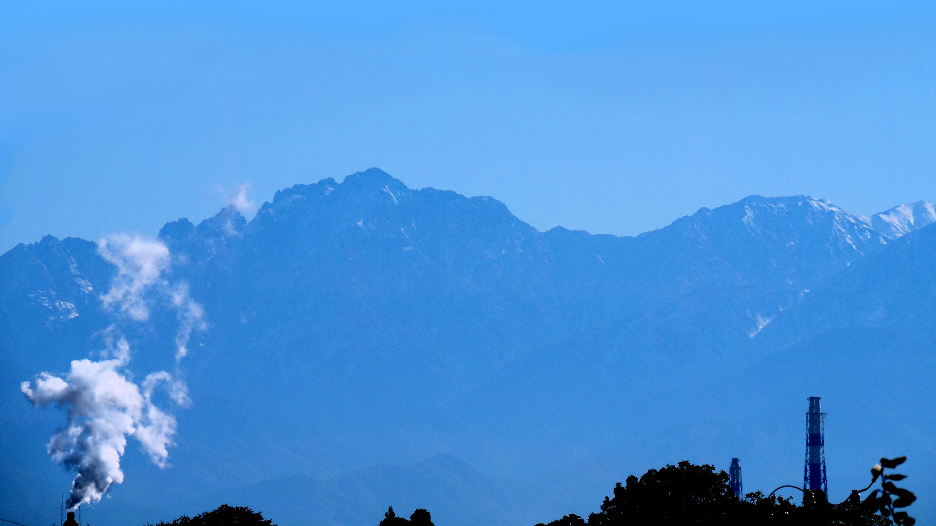 高岡市万葉歴史館前から剱岳の初冠雪 急峻なため谷筋に少し雪