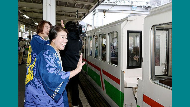 とあいさつした。社長や社員、宇奈月温泉の女将らがホームに並び、最終列