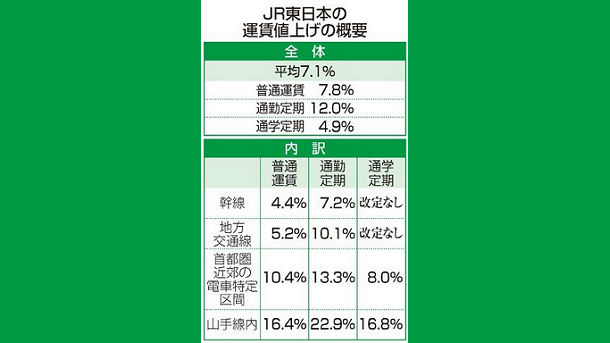 東日本の値上げ率は普通運賃が平均7.8%、通勤定期が平均12.0%、