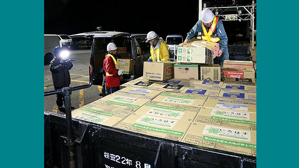 この日は早朝から作業員が、野菜や飲料などの段ボール箱を貨車に積み込