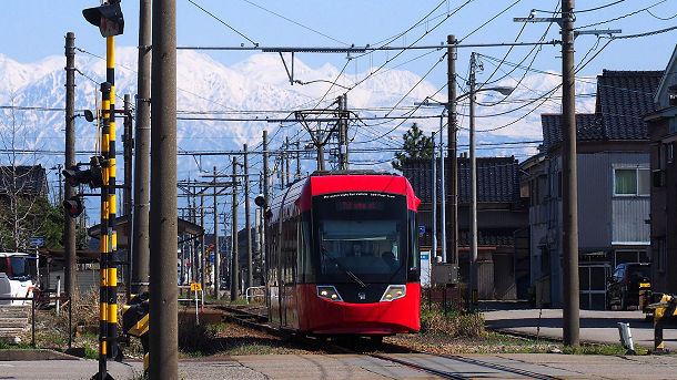 新湊港線西新湊駅を発車したMLRV1001高岡駅行き 2023/03/22