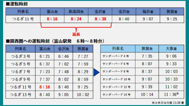 このほか、「つるぎ」は福井方面に向かう8時40分金沢発を富山発に変