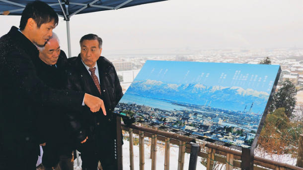立山連峰の絶景、写真看板で紹介 高岡・伏木の