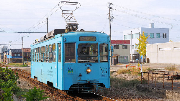 新湊港線第一イン新湊クロスベイ前駅に到着する7073越ノ潟行き