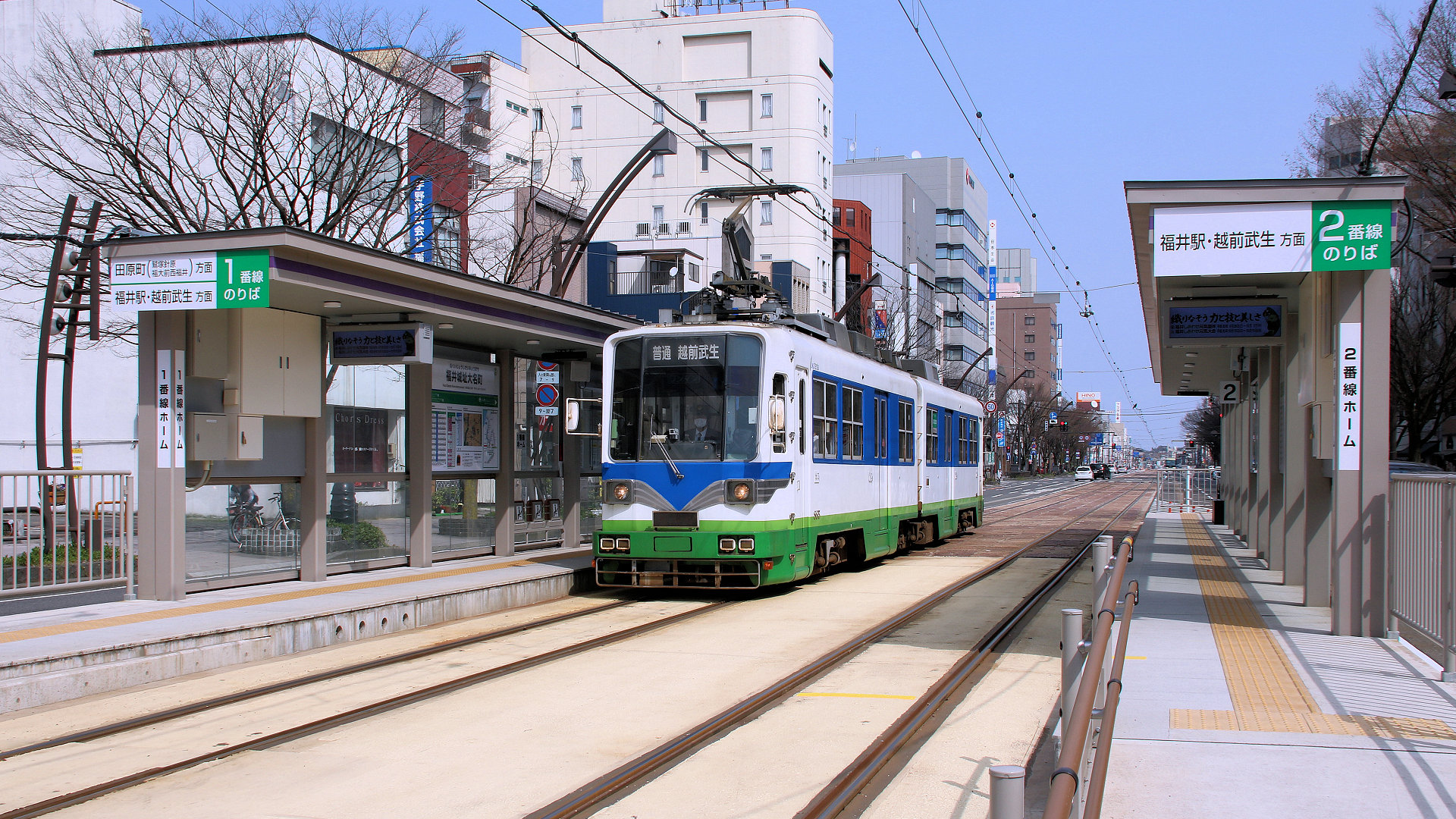福井城址大名町駅に停車中の884+885越前武生行き 2018/04/01