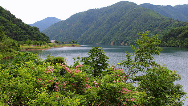 富山県営境川ダムの桂湖上流部からビジターセンター方向