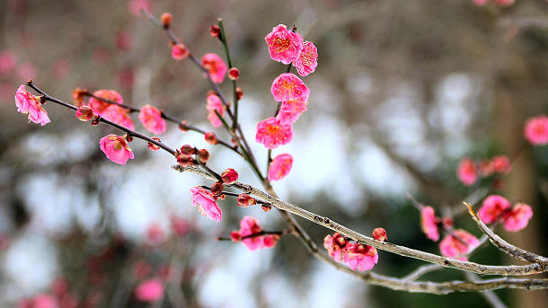 高岡古城公園の紅梅、白いのは雪 2016/01/28 撮影