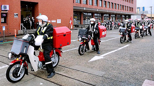 各家庭へ次々と出発する配達員=富山南郵便局