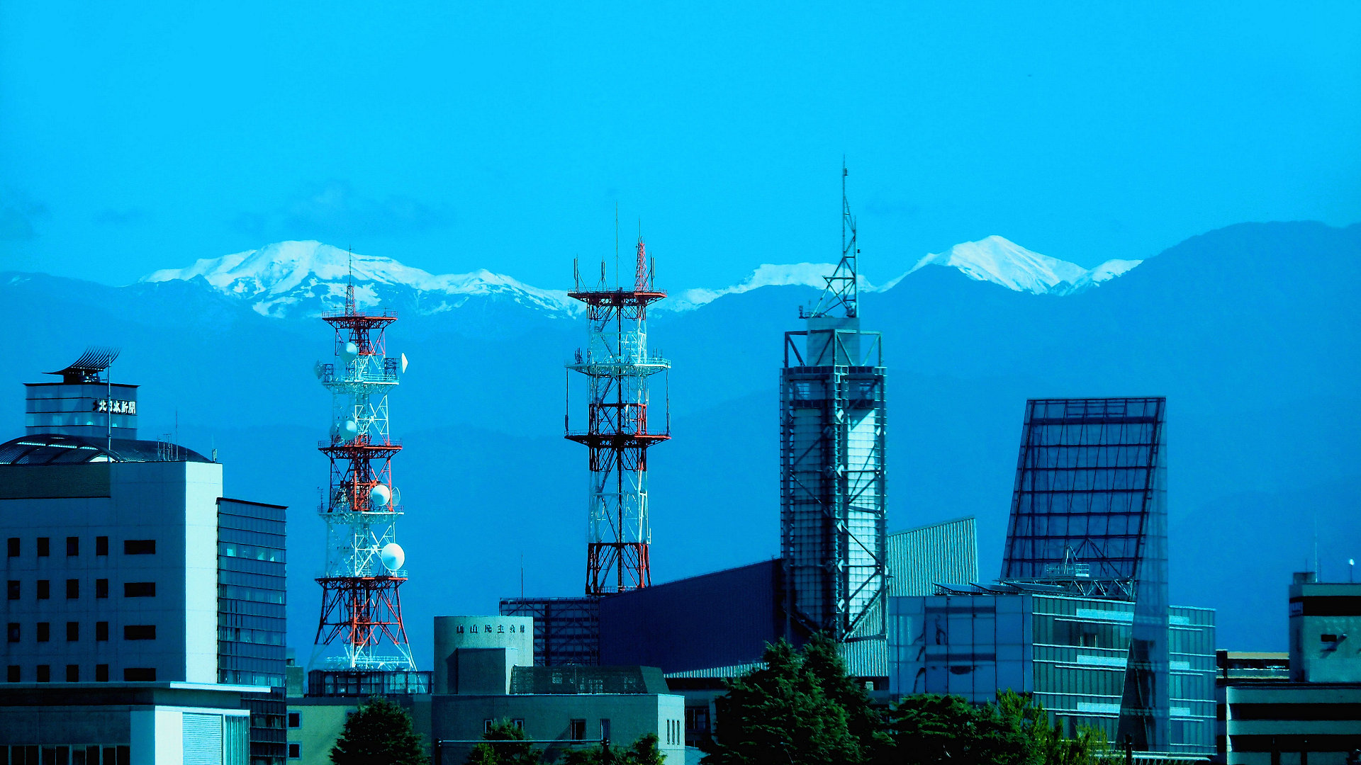 神通川富山大橋を走る市内電車から北日本新聞付近の電波塔と白馬連峰