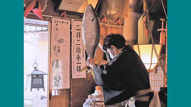 ブリ掲げ無病息災祈願 射水市・加茂神社で鰤分け神事