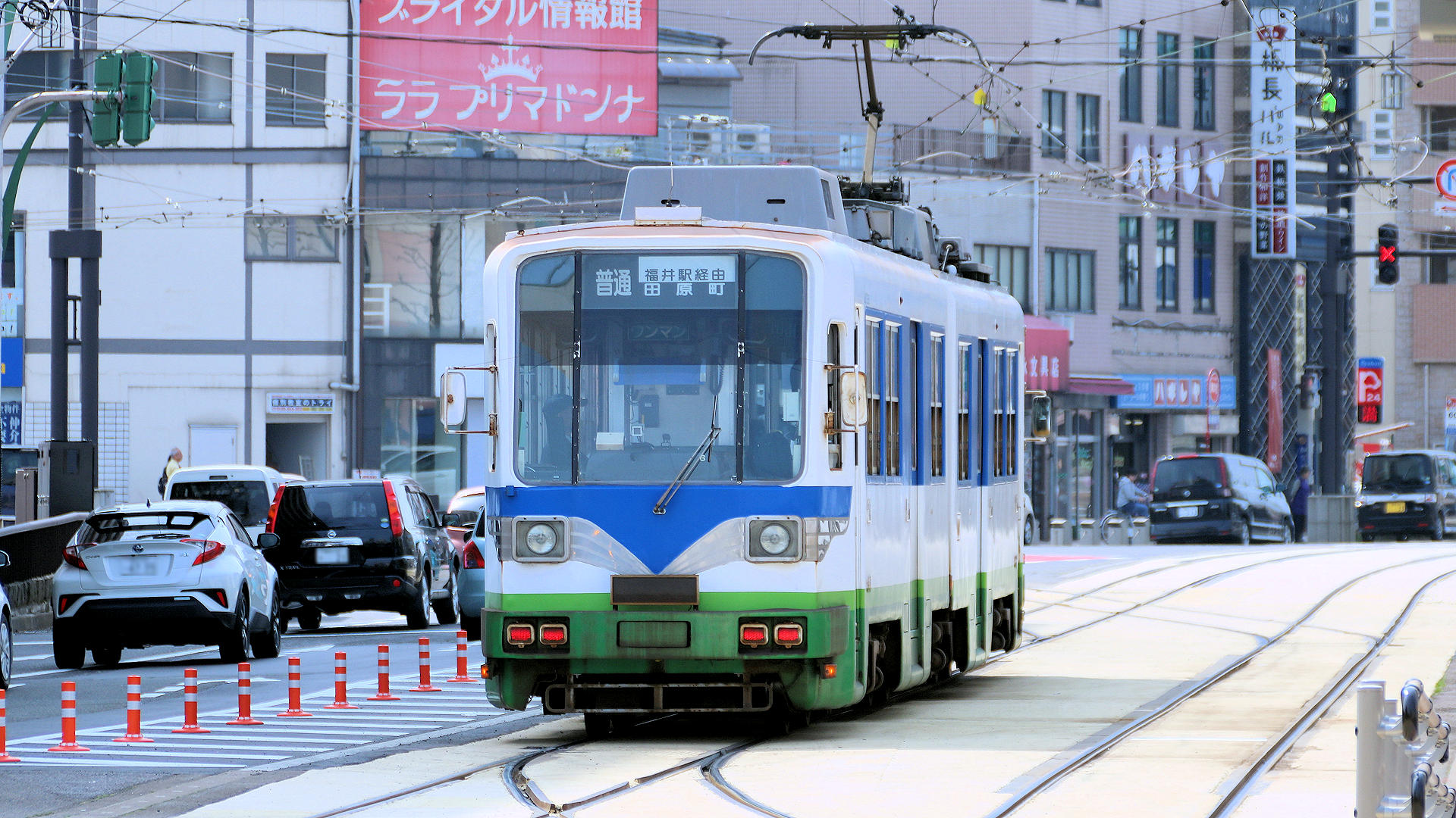 福井城址大名町駅を発車した886+887福井駅→田原町行き
