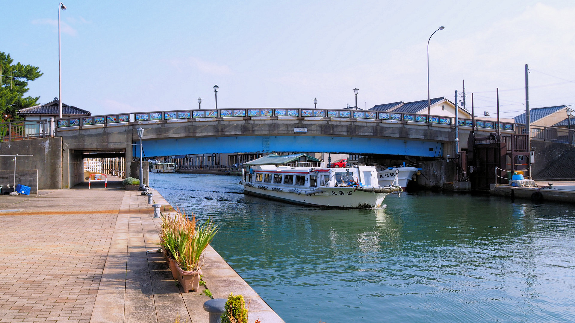 射水市新湊地区内川の神楽橋を通過した内川遊覧船万葉丸