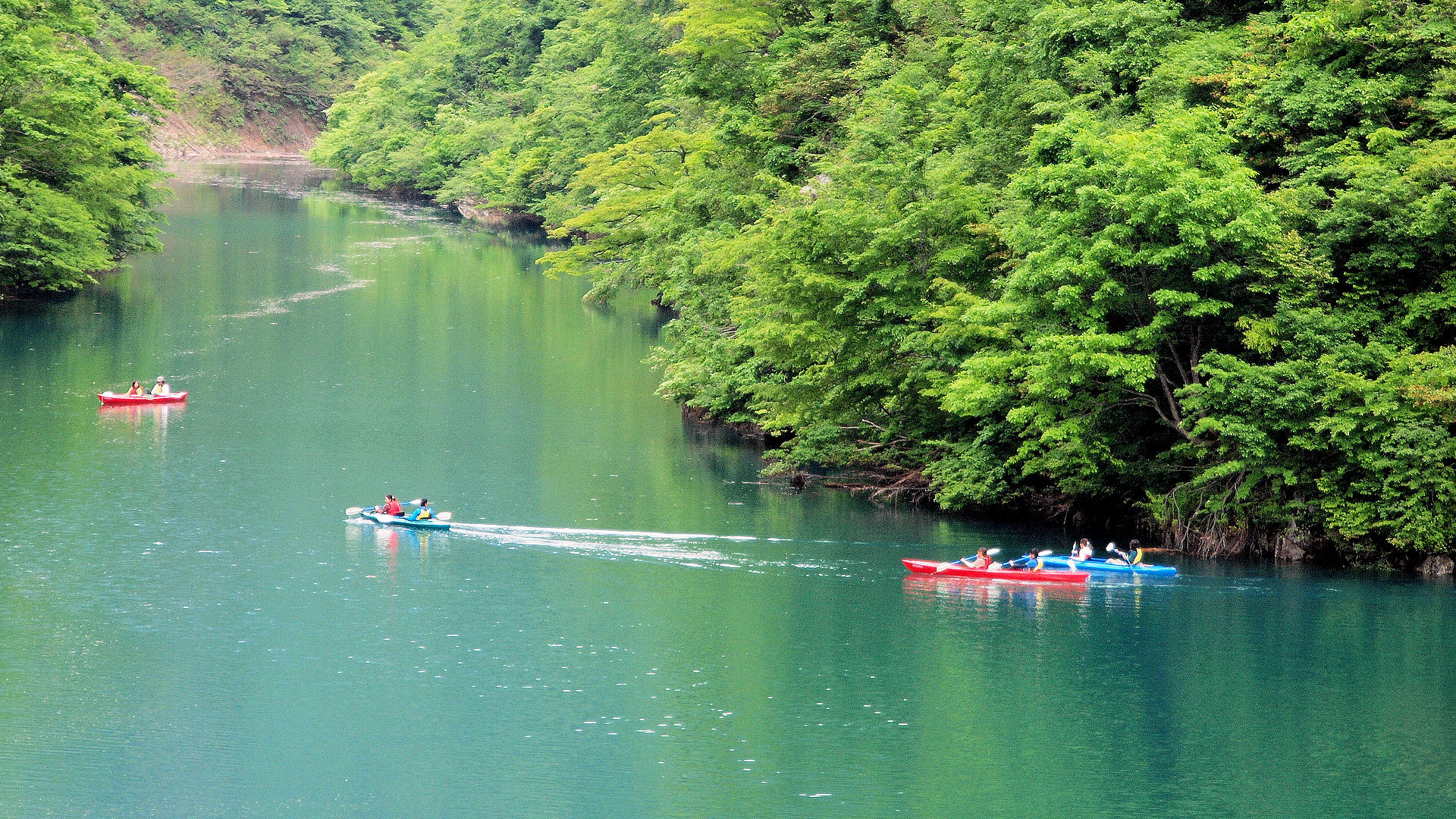 境川ダムの桂湖上流の桂橋から上流側のカヌーを楽しむ人