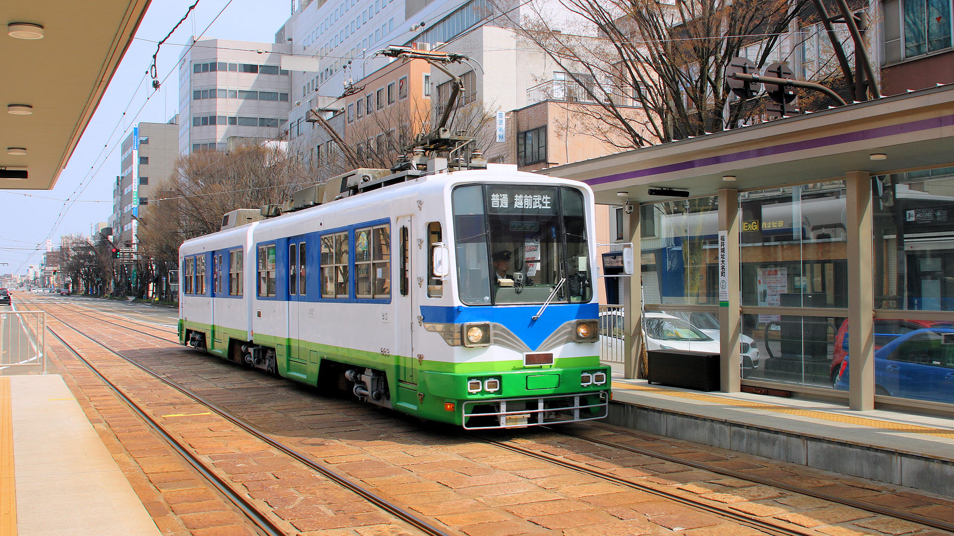 福井城址大名町駅に到着する882+883福井駅→越前武生行き
