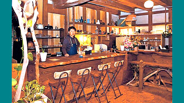 カウンターやいすは地元の木材で手作りした。店内には流木を飾り、ファ