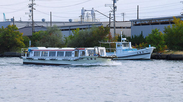 新湊地区内川の万葉線橋梁下から遊覧船万葉丸 2024/11/13 撮影