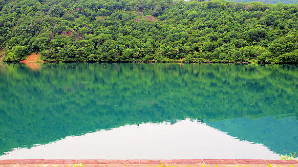 富山県営境川ダムの桂湖ビジターセンターから右岸