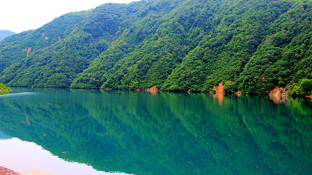 富山県営境川ダムの桂湖ビジターセンターから右岸