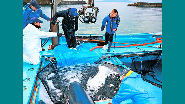 福島県からトラックで運ばれてきた稚魚を漁船の魚倉に移す乗組員ら