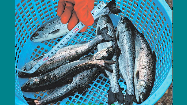 福島県から取り寄せた体長26cm、200グラムの稚魚を早朝、大境漁
