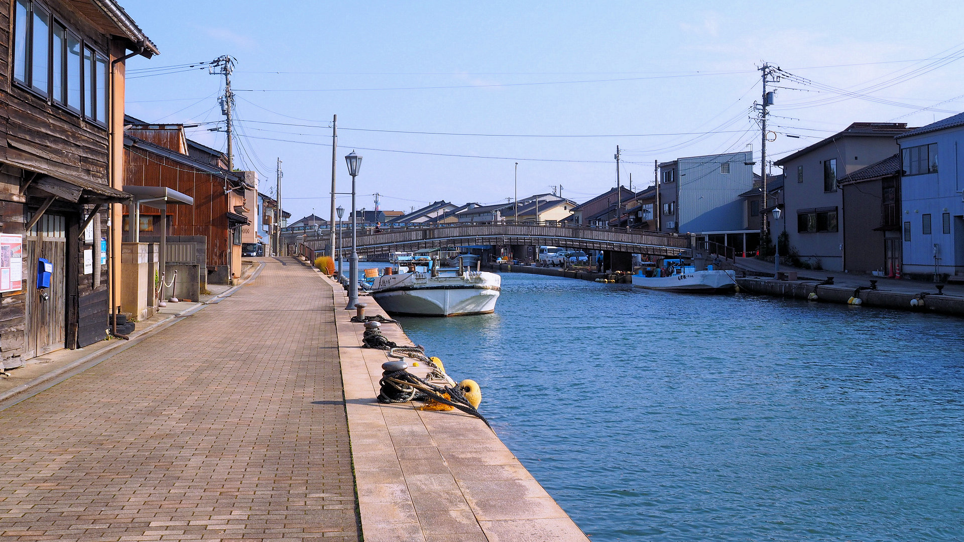 射水市新湊地区内川の番屋カフェ前から歩道橋の中新橋側