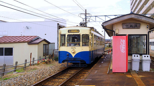 万葉線中新湊駅に到着する7071越ノ潟行き