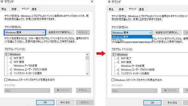 サウンド設定の「Windows標準」をクリックし「サウンドなし」を選択