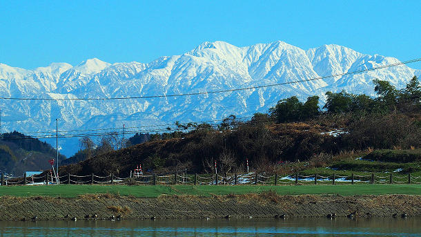 富山市山本の田尻池から白馬連峰の杓子岳、白馬鎚ケ岳、立山連峰の毛勝山、