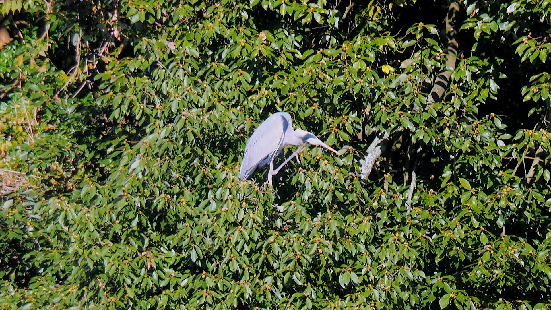 高岡古城公園本丸のアラカシ留まるアオサギ 2023/11/22 撮影