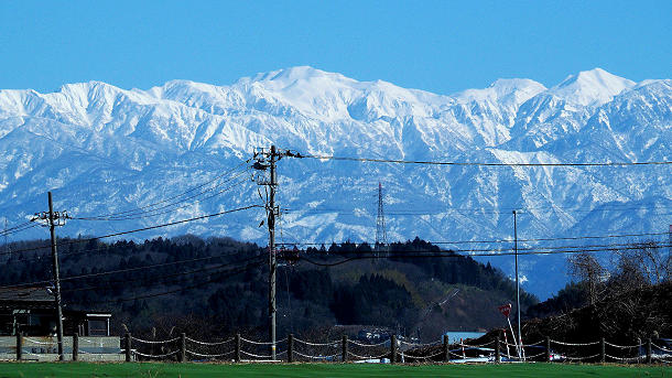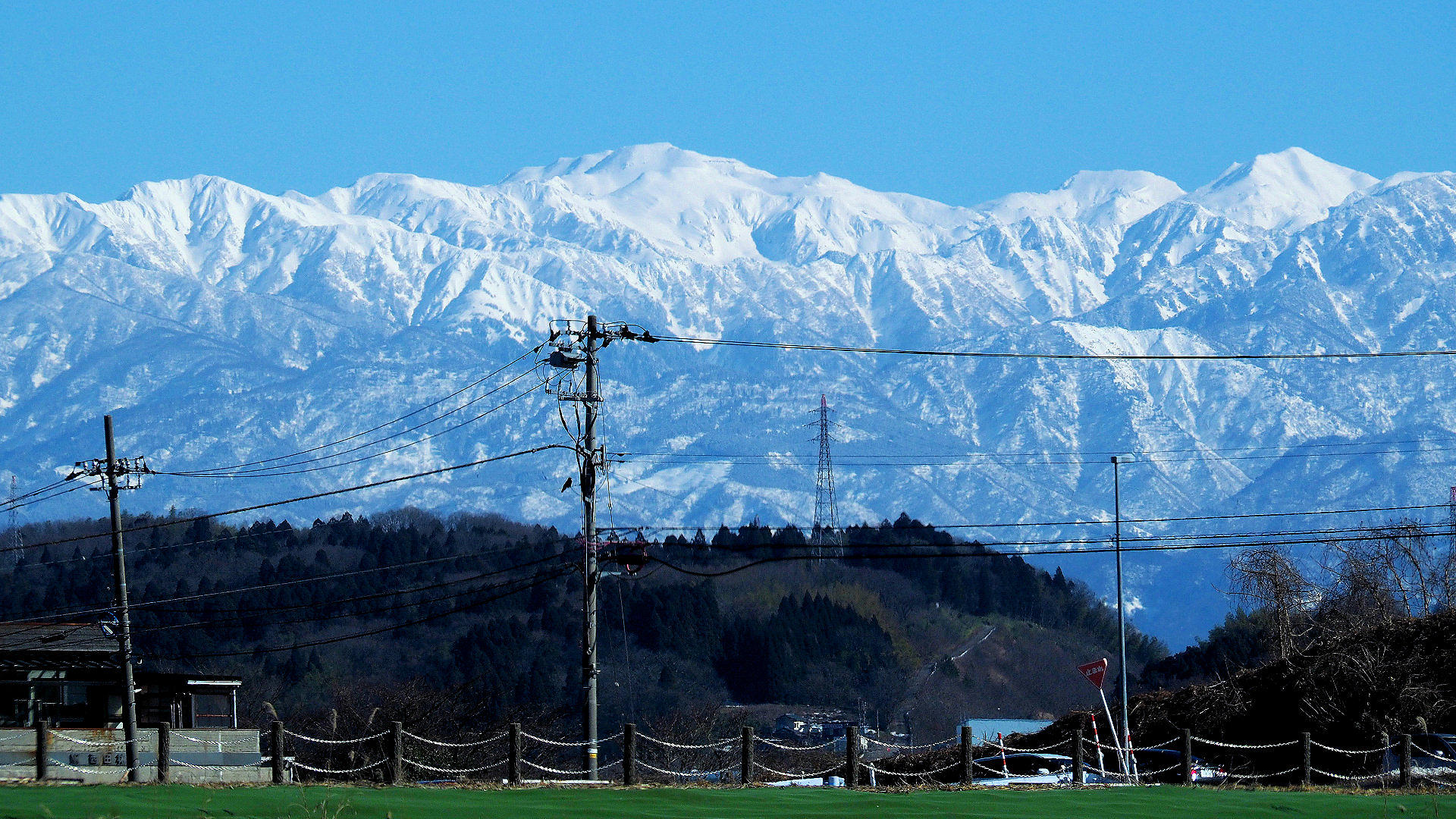 富山市山本の田尻池から白馬連峰の白馬岳、杓子岳、白馬鎚ケ岳