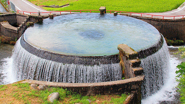 東山円筒分水槽は、3つの農業用水に公平に分配するための円筒分水漕。