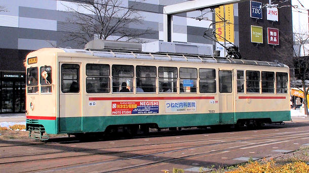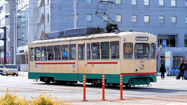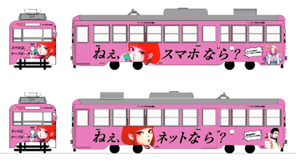 市内を走る路面電車で、同社のCMキャラクター「モモ」をデザインしたラ