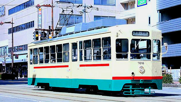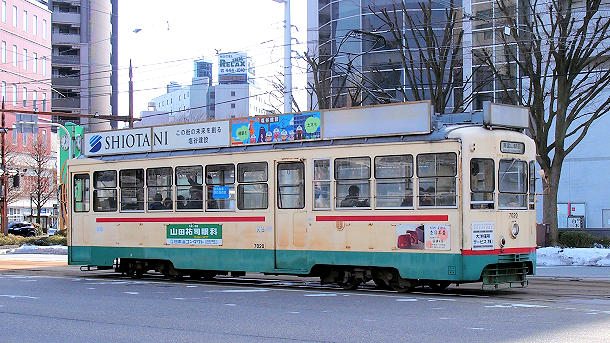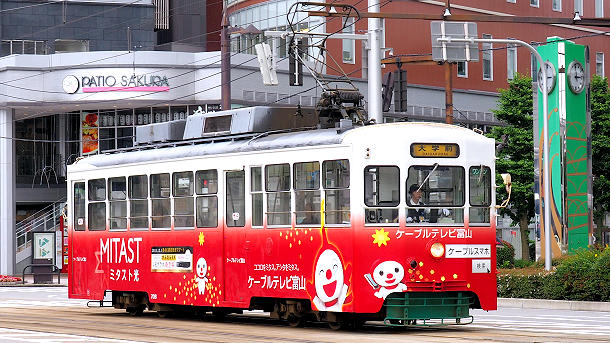 ケーブルテレビ富山の全面広告で富山駅前を走る7016