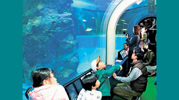 修繕を終えた富山湾大水槽の水中トンネルを訪れる家族連れ
