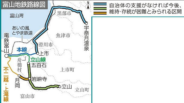 石駅、不二越・上滝線は月岡駅までとし、不採算区間は廃止の可能性がある