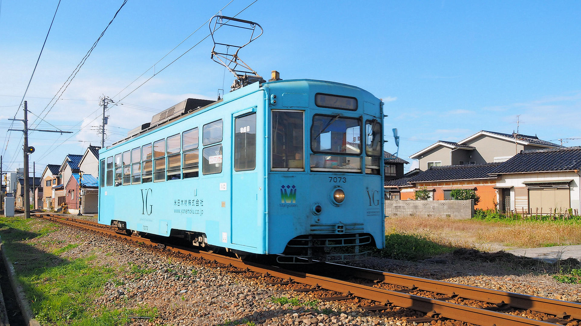 第一イン新湊クロスベイ前駅に到着する7073越ノ潟行き