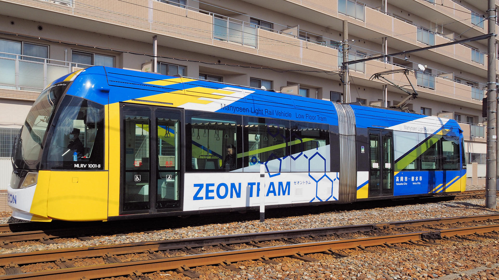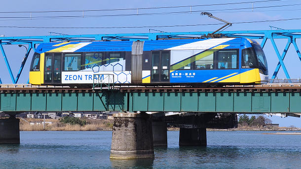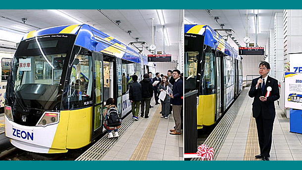 面電車・万葉線のラッピング広告を始めた。車両のお披露目式が3月8日、