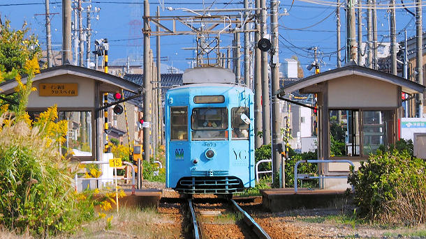 第一イン新湊クロスベイ前駅を発車した7073越ノ潟行き