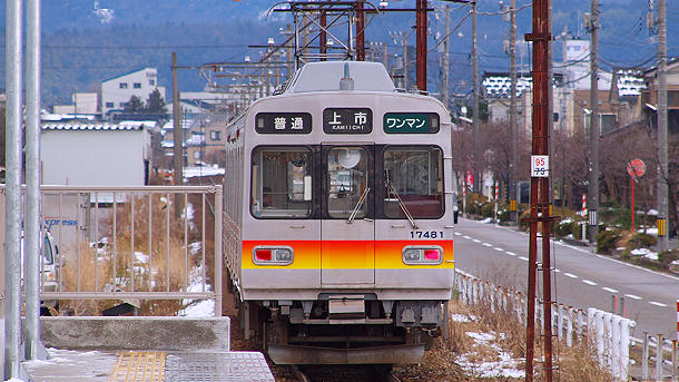 新相ノ木駅を発車した上市行き Mc17481+Mc17482