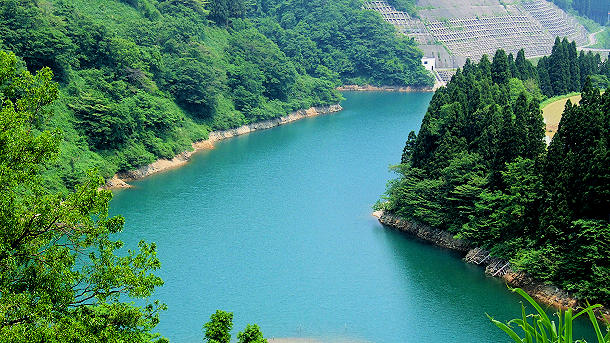 牛岳から展望できる湯谷川ダム湖