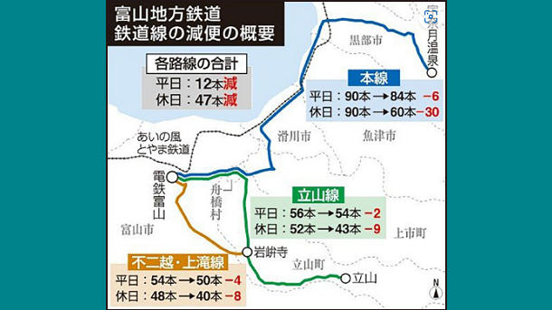 らす。立山線は平日56本から2本、休日52本から9本、不二越・上滝線